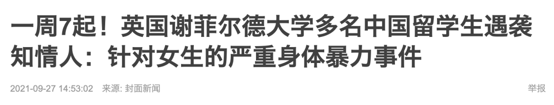 封面新闻记者透露,在谢菲尔德大学采访到了了解此事的中国留学生小伙伴,得知:从9月20日起,谢菲尔德大学附近就发生了高达7~8起针对华人留学生,尤其是单独行动的女学生的严重暴力事件,有的学生受伤非常严重。大多是刚到谢大不久的新生。