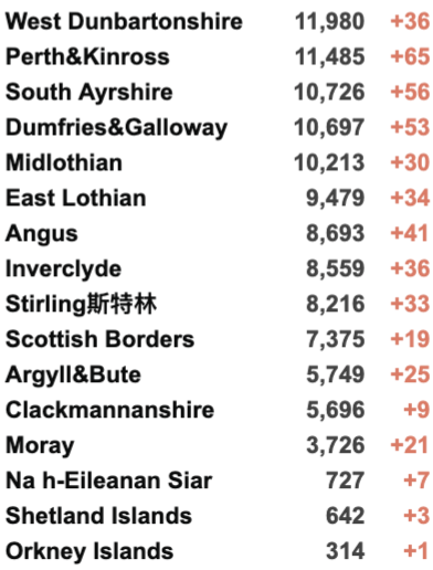 从2020年3月5日以来,苏格兰地区共有21,057名(+176)确诊患者出院。截至9月27日午夜,近期住院的疑似/确诊新冠患者1,023名(+12),其中76名(-3)确诊新冠在重症监护室ICU。