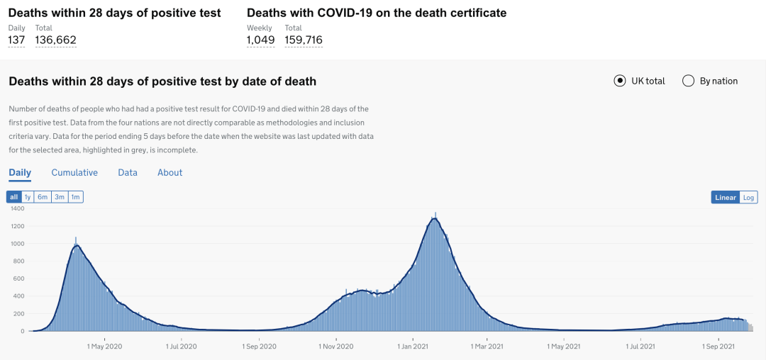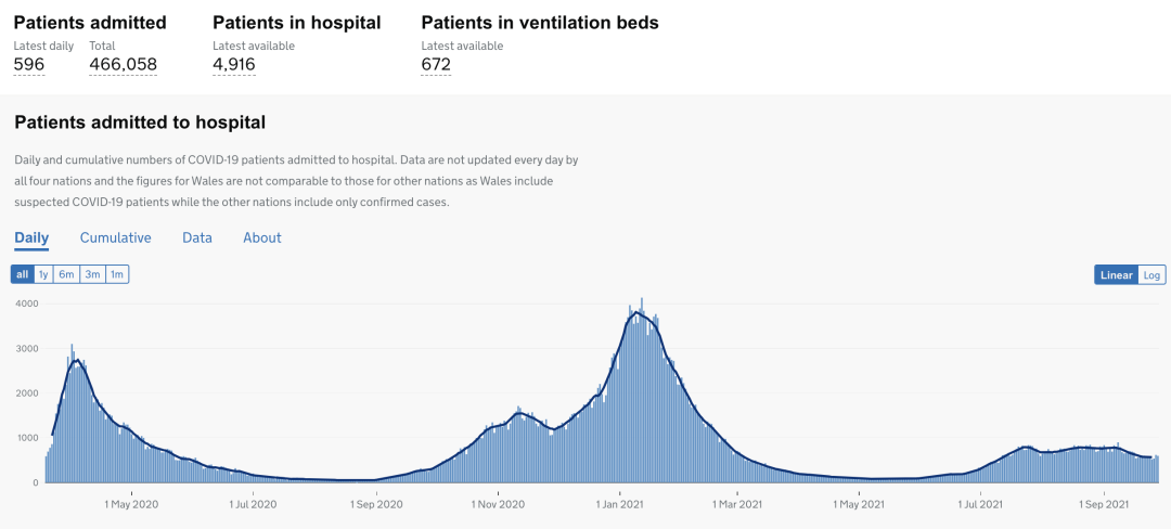 目前英格兰地区使用呼吸机的新冠患者有672人(+1);病亡新冠患者总计119,600人(+87)。