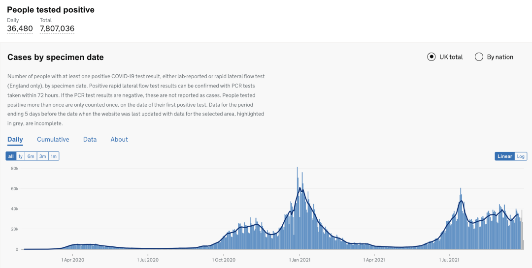 根据最新的检测和追踪数据显示,英格兰地区新冠检测呈阳性的人数比前一周增加了18%。在截至9月22日的一周内,英格兰共有191,771人至少一次新冠检测呈阳性,比前一周增加了近五分之一。