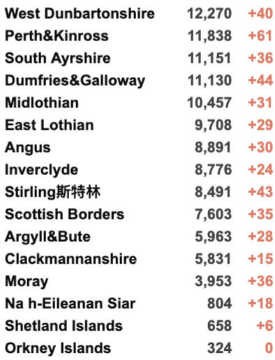 从2020年3月5日以来,苏格兰地区共有21,383名(+162)确诊患者出院。截至10月1日午夜,近期住院的疑似/确诊新冠患者983名(-37),其中65名(-6)确诊新冠在重症监护室ICU。