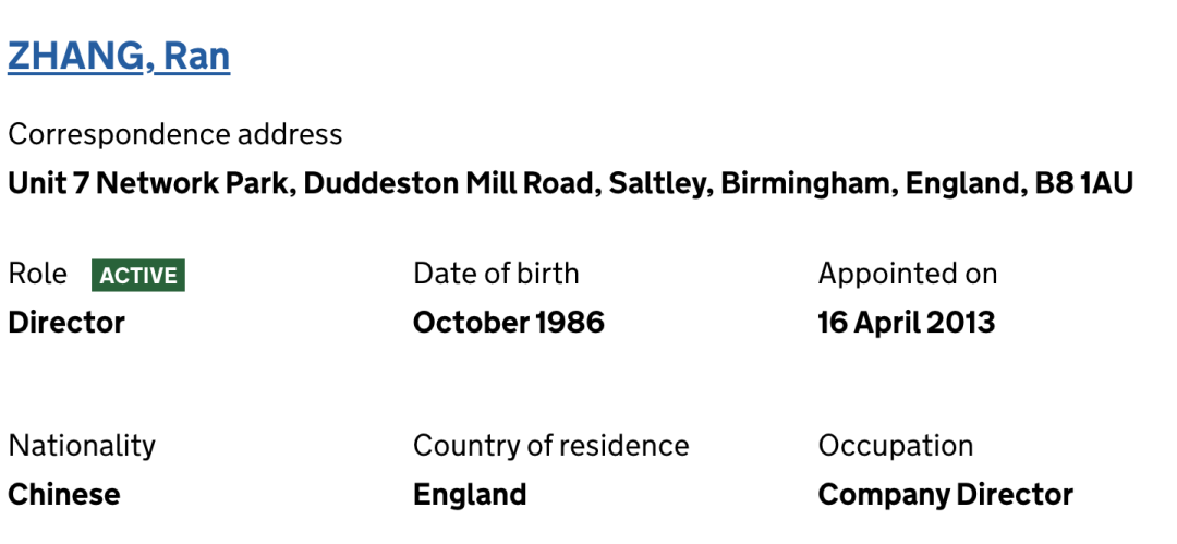 根据英国商业部的公司出册网站显示,英超物流仍然处于活跃状态。此外,三位老板只有Zhang Ran一人是董事职位,其他二人均为退休状态。