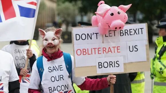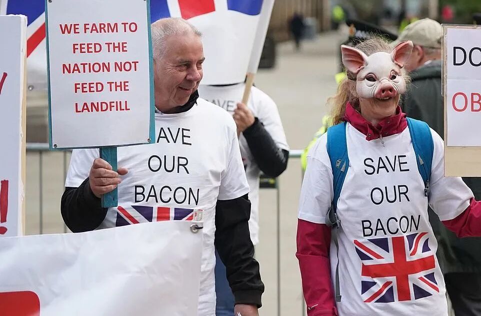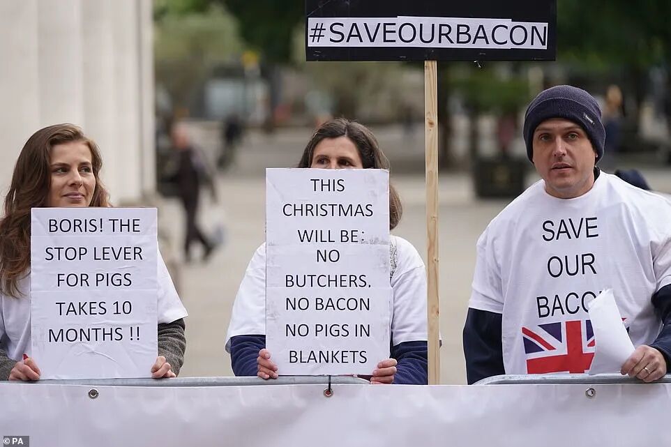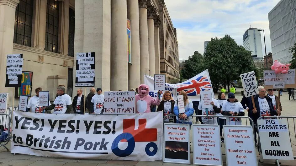 尽管首相鲍里斯(Boris Johnson)说,大规模的杀猪行动“尚未开始”,但身穿”save our bacon”(拯救我们的培根)T恤衫的农民们在曼彻斯特的保守党会议外聚集抗议,坚称“现实是不一样的”。
