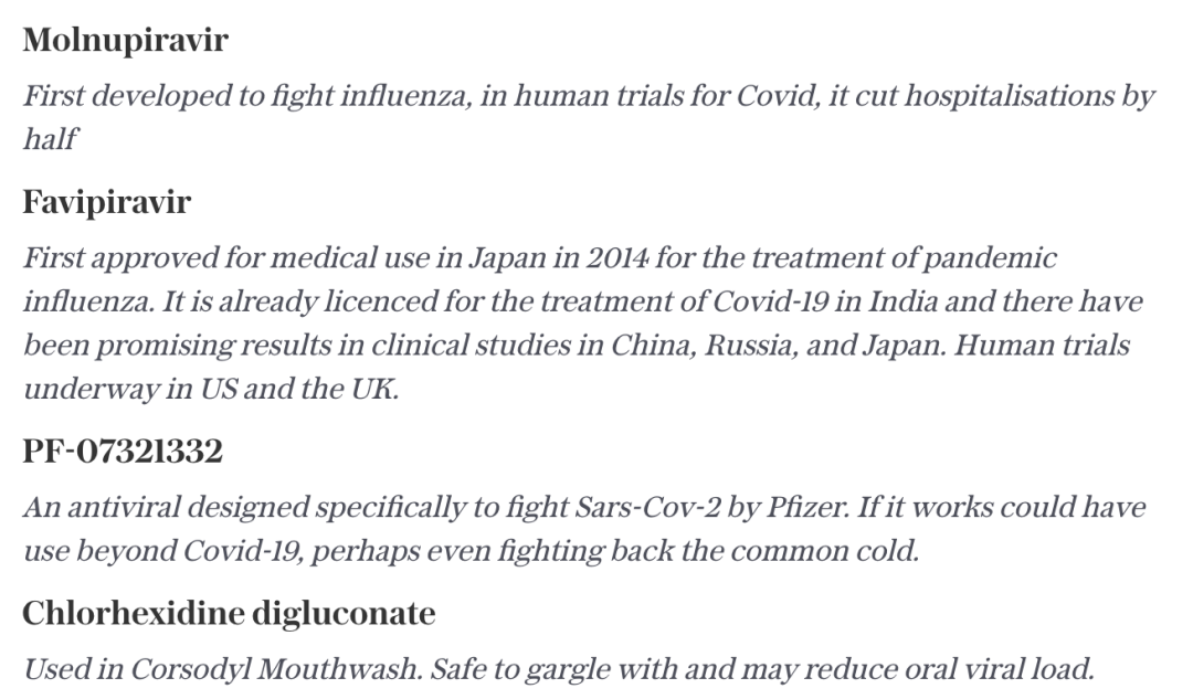 2014年首次在日本被批准用于治疗流感。它已在印度被授权用于治疗新冠,在中国、俄罗斯和日本的临床研究中也取得了可喜的成果。在美国/英国正在进行人体试验。
