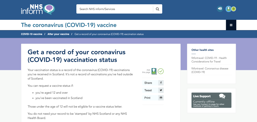 苏格兰居民,拥有苏格兰GP,但在英国其他地区(英格兰、威尔士、北爱尔兰)完成疫苗接种:可通过接种地区的官方接种证明申请方式获得接种证明。