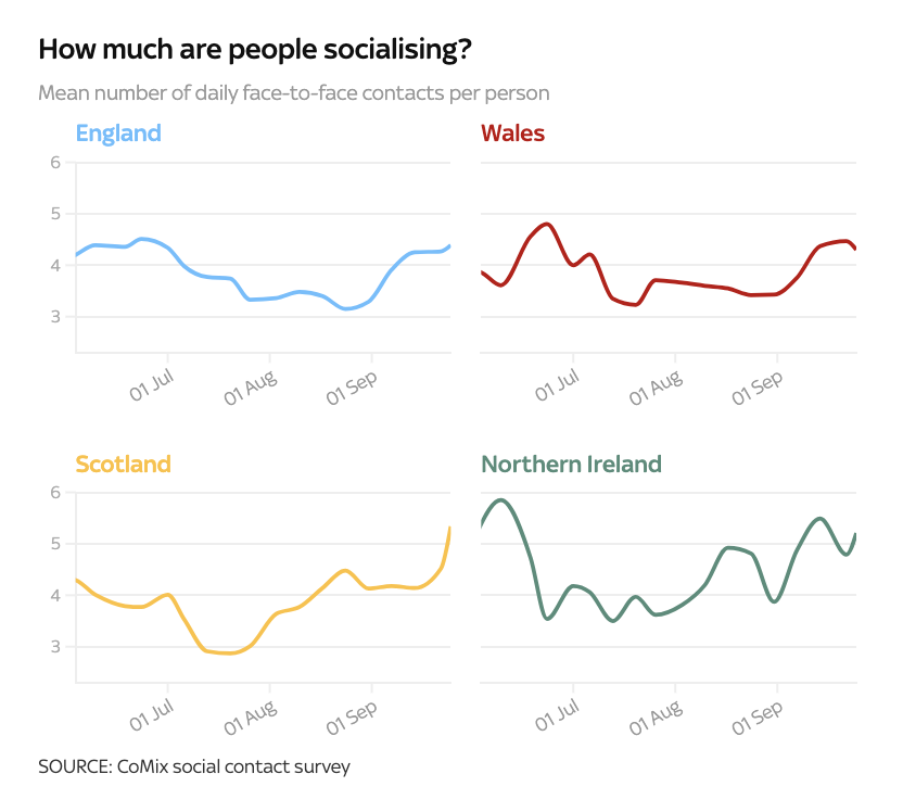 此外,官方还调查了人们在疫情解封后人们社交的舒适度——调查显示,随着疫苗的推广和新冠限制的取消,苏格兰地区的每日面对面接触平均数量增加最高。