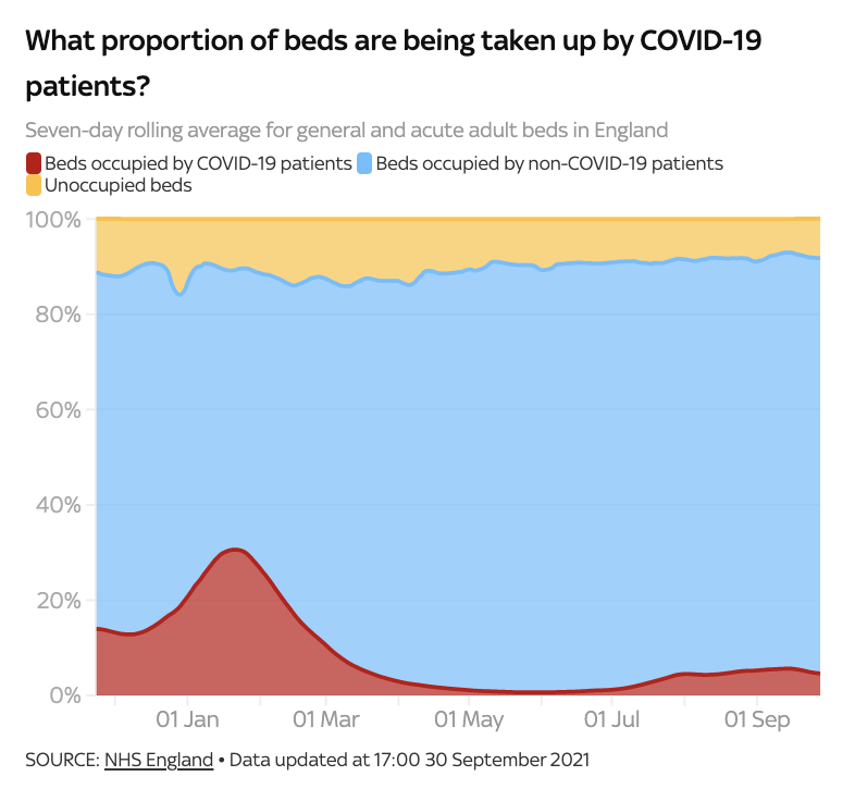 那么目前NHS国家医疗服务系统医院的住院情况如下:自7月初以来,越来越多的医院床位被新冠患者占用,但远没有年初疫情严重,目前已经再次呈下降趋势——新冠患者只占所有住院患者人数的仅仅不到10%。