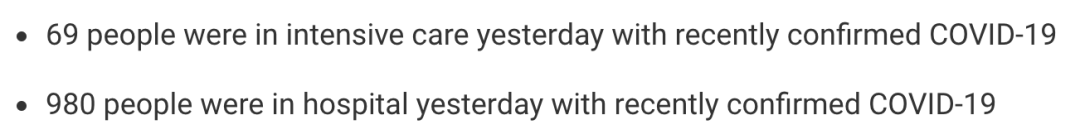 从2020年3月5日以来,苏格兰地区共有21,755名(+79)确诊患者出院。截至10月7日午夜,近期住院的疑似/确诊新冠患者980名(-8),其中69名(+1)确诊新冠在重症监护室ICU。