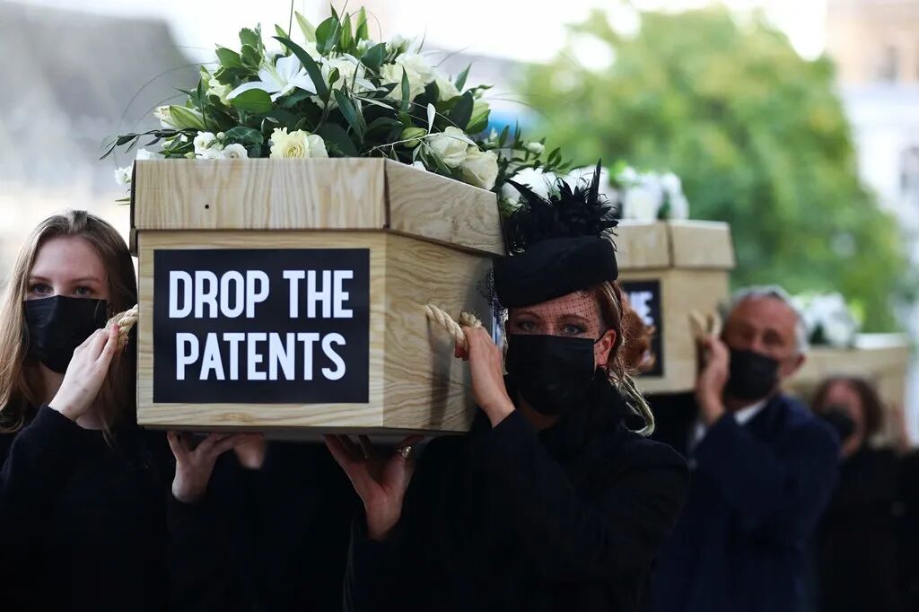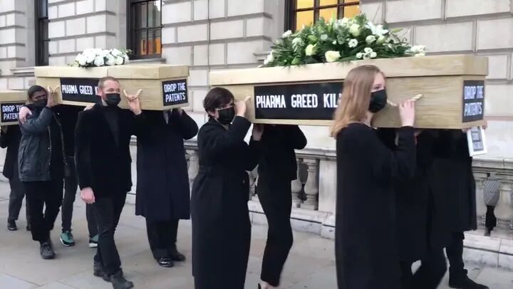 Global Justice Now组织了这次抗议活动,棺材则象征着全球新冠的死亡,他们呼吁英国不要将疫苗进行专利申请,让全世界都可以获得新冠疫苗的接种,从而早日结束疫情。
