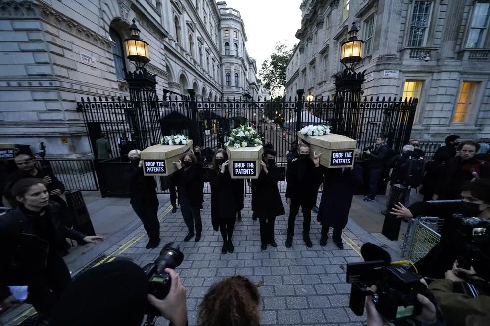 10月12日(周二)晚,在英国政府所在地,一群示威的人们身着黑色,抬着棺材站立在大门口——据悉,这件事发生在英国紧锣密鼓的疫苗专利谈判之前。