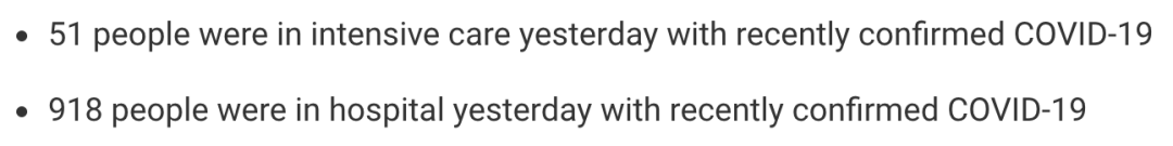 从2020年3月5日以来,苏格兰地区共有22,163名(+71)确诊患者出院。截至10月13日午夜,近期住院的疑似/确诊新冠患者918名(-17),其中51名(=)确诊新冠在重症监护室ICU。