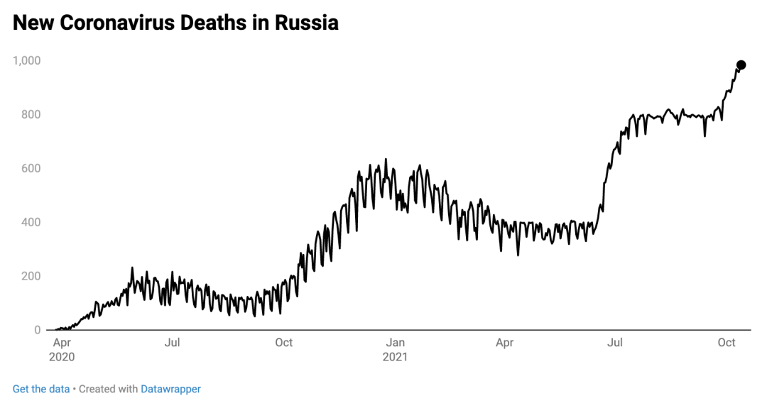 10月13日(周三),俄罗斯连续第二天创造了日增新冠死亡人数的最高纪录:在过去的24小时内,当局记录了984例死亡,这是自疫情开始以来最高的单日死亡人数,同时还伴随有28,717例新增确诊。