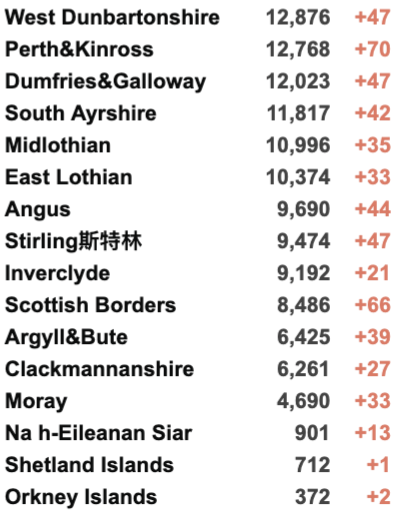 从2020年3月5日以来,苏格兰地区共有22,556名(+62)确诊患者出院。截至10月19日午夜,近期住院的疑似/确诊新冠患者869名(+12),其中46名(-2)确诊新冠在重症监护室ICU。