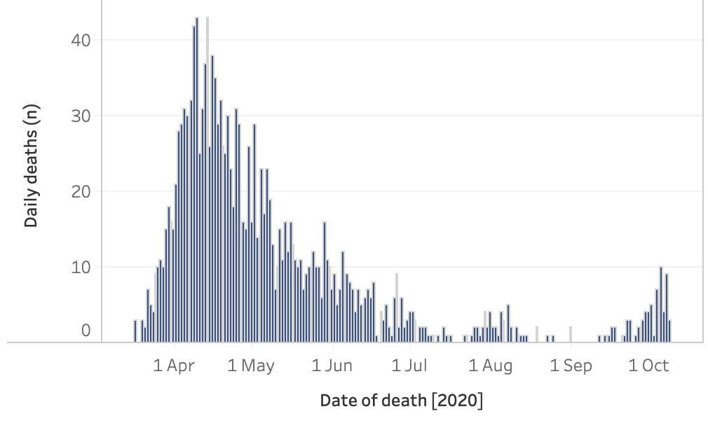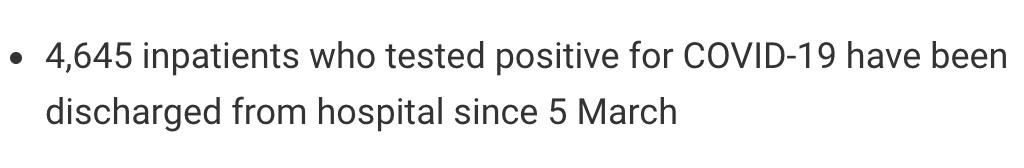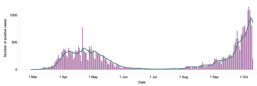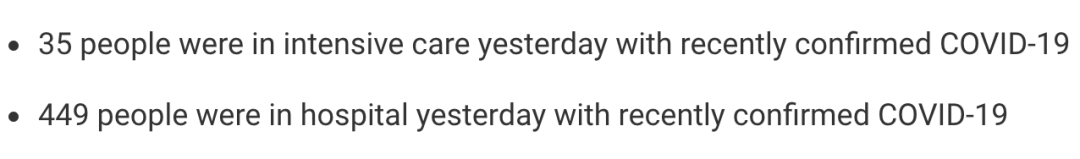 从3月5日以来,苏格兰地区一共有4,645名(+19)确诊患者出院。截至10月11日午夜,近期住院的疑似/确诊新冠患者共449名(+17),其中35名(+1)确诊新冠在重症监护室ICU。