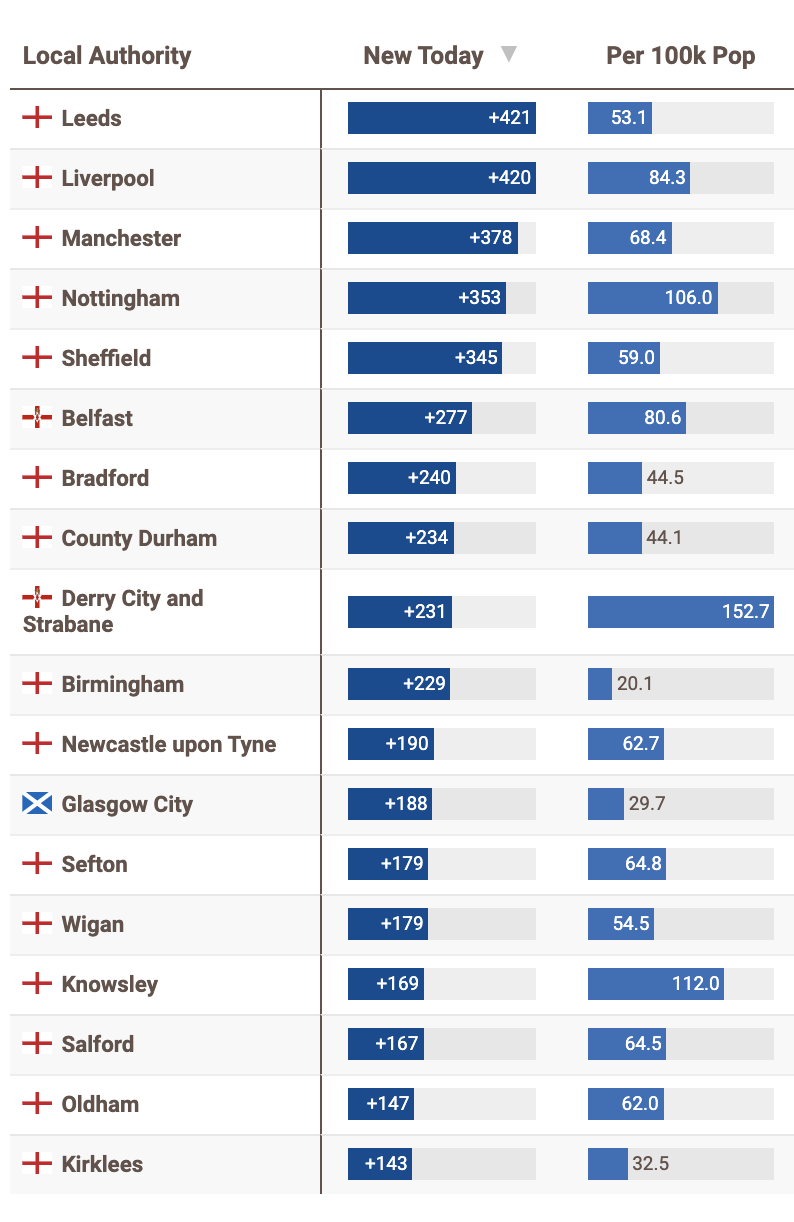 在新增前20当中,还有苏格兰的格拉斯哥(+188)以及北爱尔兰的贝尔法斯特(+277)和德里(+231)疫情也较为严重。