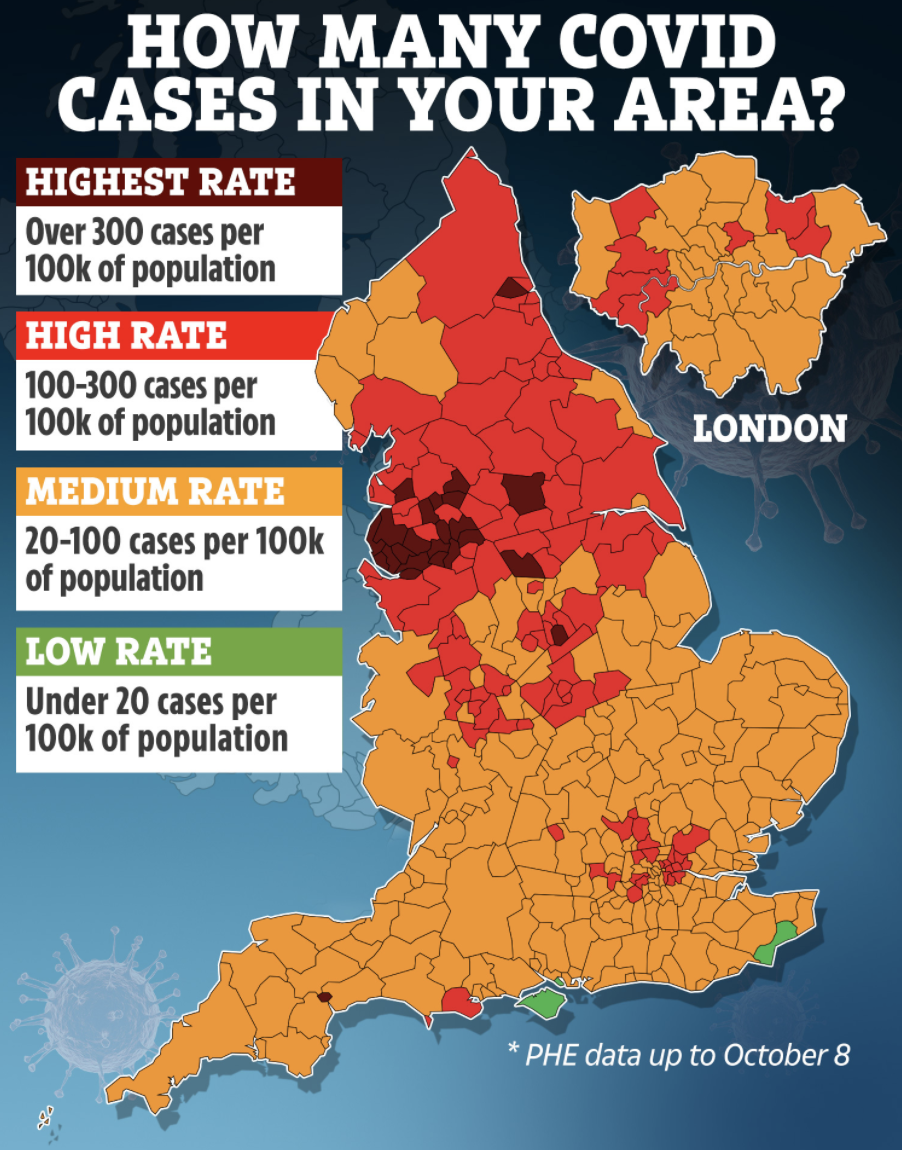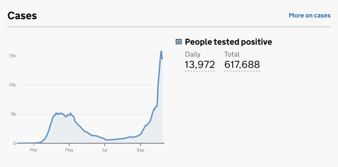 伦敦、曼彻斯特当地疫情严重,目前为2级,但很有可能在之后升级为3级;利兹、谢菲尔德、伯明翰、诺丁汉、纽卡斯尔等地区被列为2级高风险疫情地区。