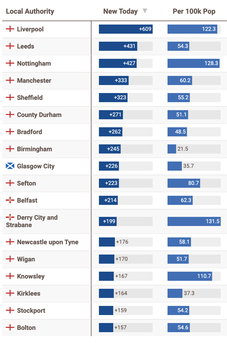 在新增前20当中,还有苏格兰的格拉斯哥(+226)以及北爱尔兰的贝尔法斯特(+214)和德里(+199)疫情也较为严重。