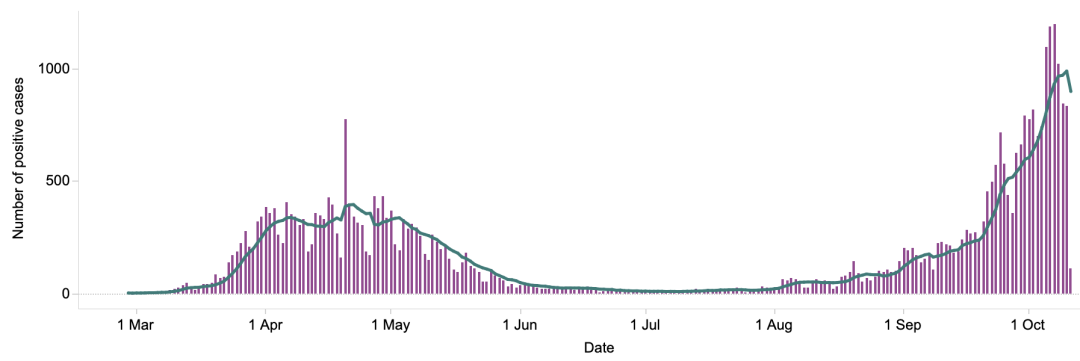 截止至2020年10月12日(周一)英国时间09:00,累计检测结果量25,476,034次(+258,955);累计确诊617,688例(+13,972);累计病亡42,875例(+50)。