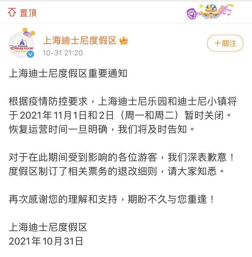 今日(10月31日)傍晚,上海迪士尼度假区官方微博发布消息称,接外省市协查通报,为配合新冠疫情流调,上海迪士尼乐园和迪士尼小镇从即刻起停止游客进入。