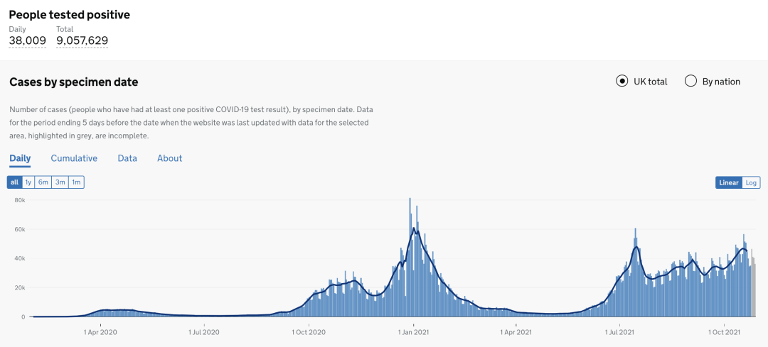 截止至2021年10月31日(周日)英国时间09:00,累计检测结果量326,700,390(待更新);累计确诊9,057,629例(+38,009);累计病亡140,632(+74)。
