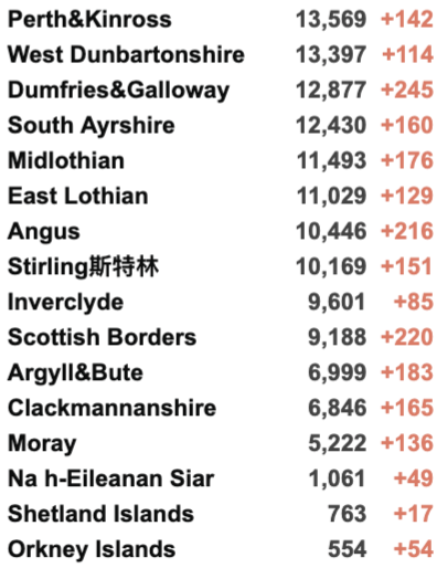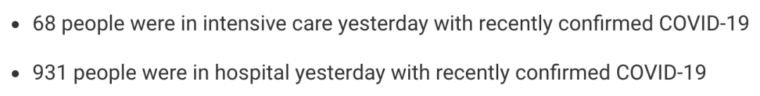 从2020年3月5日以来,苏格兰地区共有23,404名(+132)确诊患者出院。截至11月1日午夜,近期住院的疑似/确诊新冠患者931名(+5),其中68名(+8)确诊新冠在重症监护室ICU。