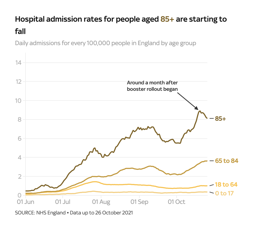 在过去的几周里,新冠的传播在所有年龄组中开始放缓,老年人的住院率开始下降。自10月20日以来,85岁以上老人的住院人数已经从每10万人中的8.9人略微下降到8.1人。