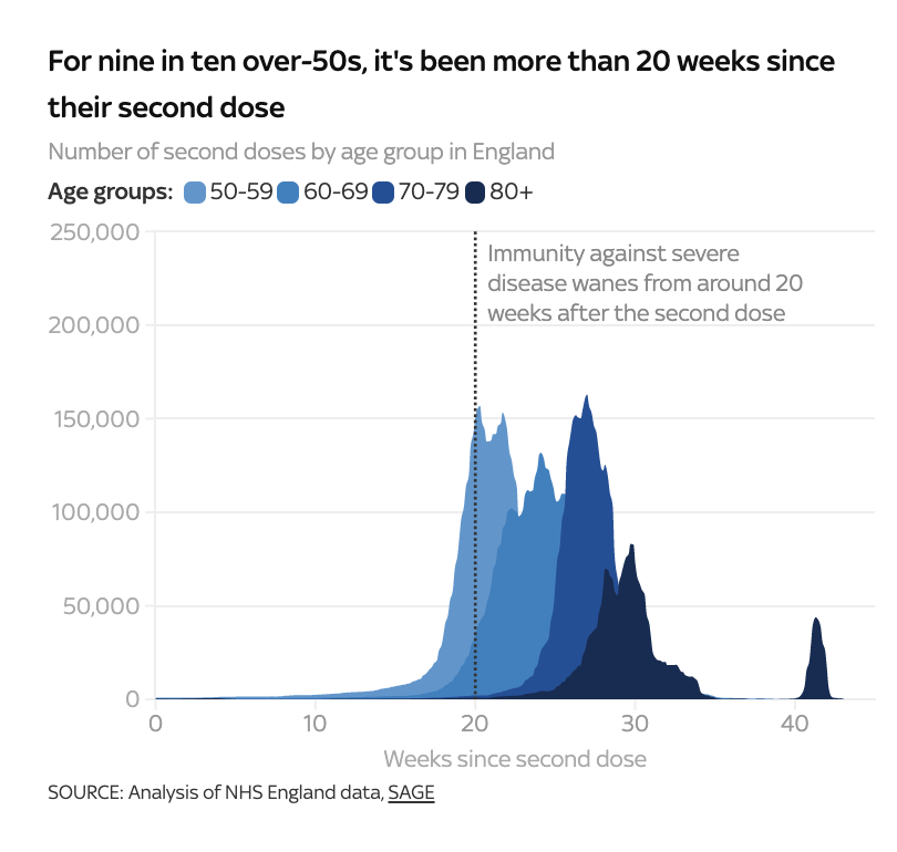 有证据表明,从第2剂疫苗接种后10周左右开始,疫苗对感染和轻症的保护效果就开始下降,老年人和临床脆弱人群对严重疾病的保护效果下降最明显的时期从接种后的第20周左右开始。