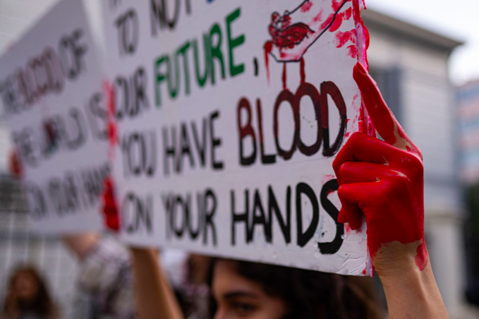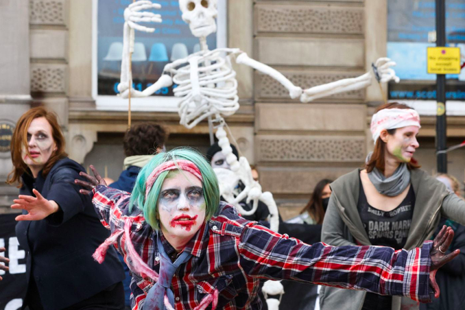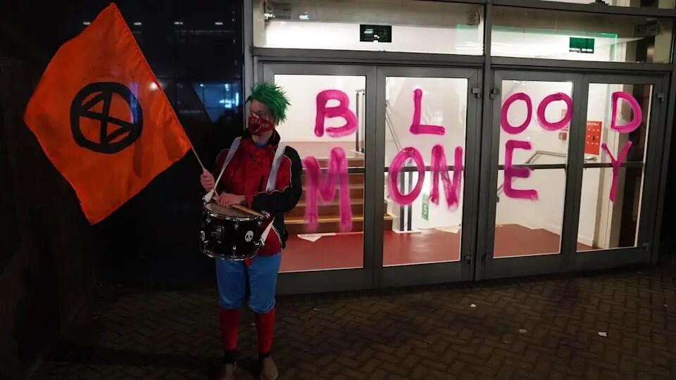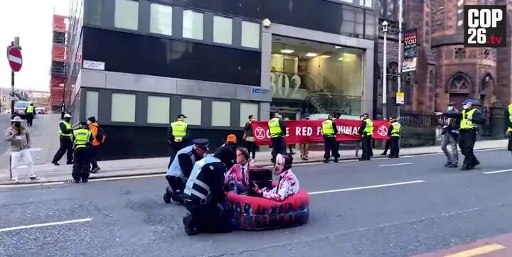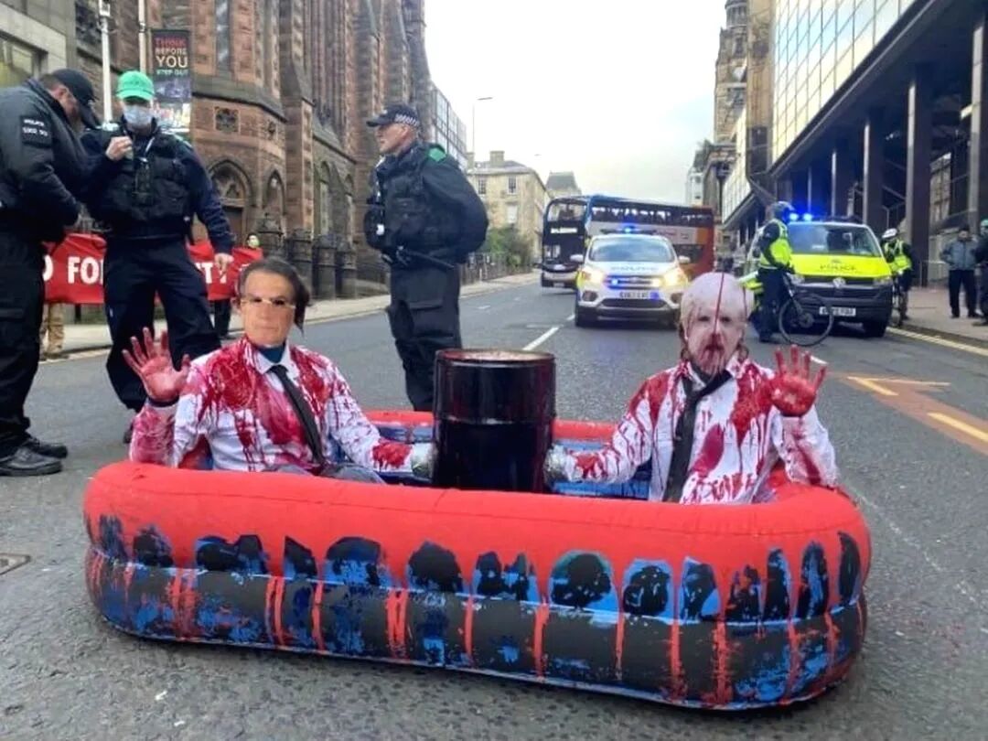 于此同时,抗议示威活动仍在加剧。在格拉斯哥最繁忙的街道之一,一条“染血”的橡皮艇横栏在路中间,示威者们在房屋建筑上用红油漆写下“血钱”(Blood Money),现场有三个人被捕。
