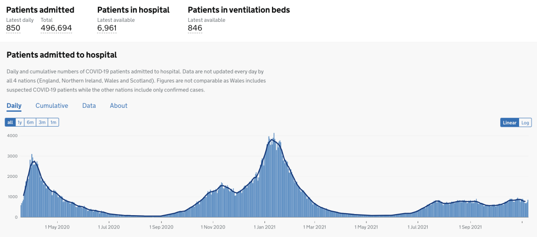 11月10日数据:目前住院的确诊新冠患者6,961人,累计住院新冠患者总数为496,694(+850)。
