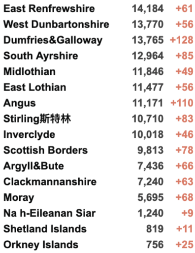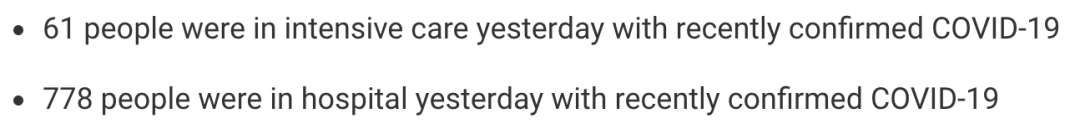 从2020年3月5日以来,苏格兰地区共有24,031名(+73)确诊患者出院。截至11月10日午夜,近期住院的疑似/确诊新冠患者778名(+25),其中61名(+4)确诊新冠在重症监护室ICU。