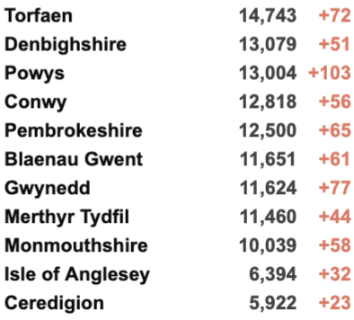 格拉摩根谷(Vale of Glamorgan)的感染率位居第二,新增943例病例,感染率从每10万人中有732.5人略微下降至697.0人。