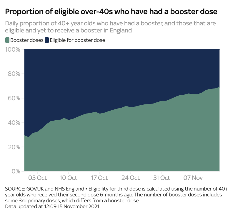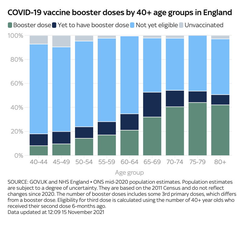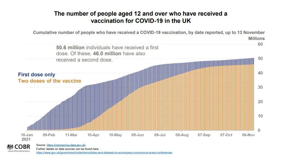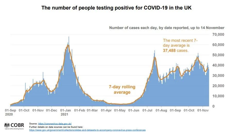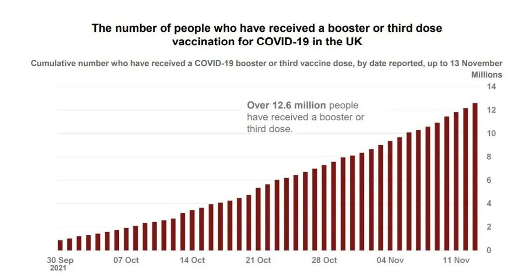 截至11月15日(周一),已有约1,300万人接种了第3剂疫苗。副首席医疗官Jonathan Van-Tam教授在疫情发布会赞叹了英国的第3剂加强疫苗推广速度,但是如果人们不积极配合接种加强剂,他预测未来几个月英国疫情可能会更加严重。