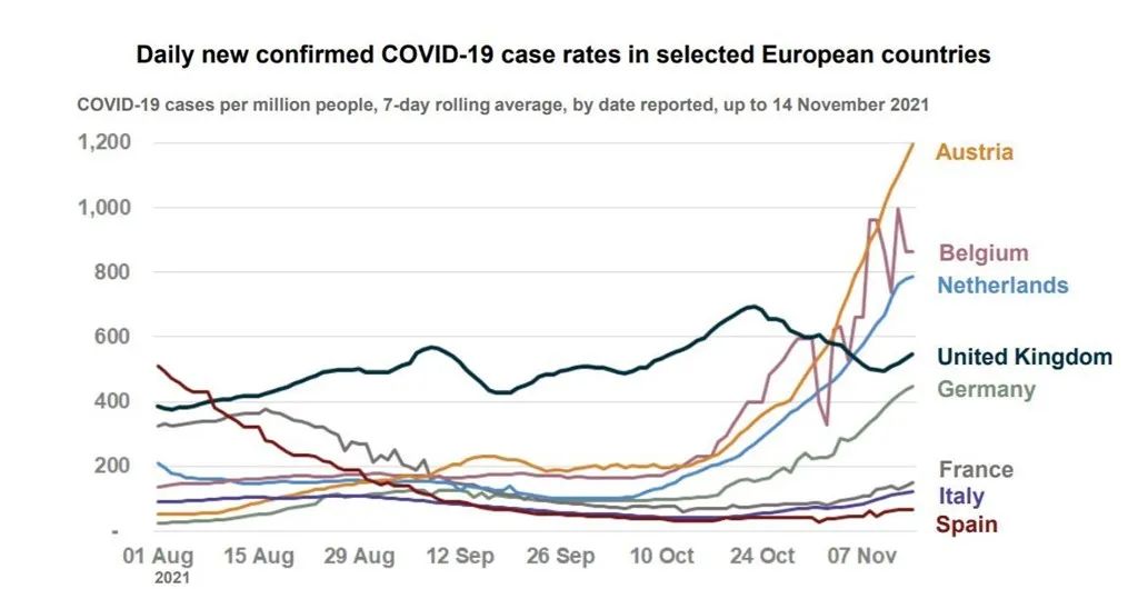 11月15日(周一),由于奥地利当地感染率激增至创纪录的水平,当地官方宣布:约200万没有完全接种新冠疫苗的人从今日起开始接受封锁——未接种疫苗或未完全接种疫苗的群体没有特殊理由,比如去工作或购买必需品,必须处于居家隔离状态。