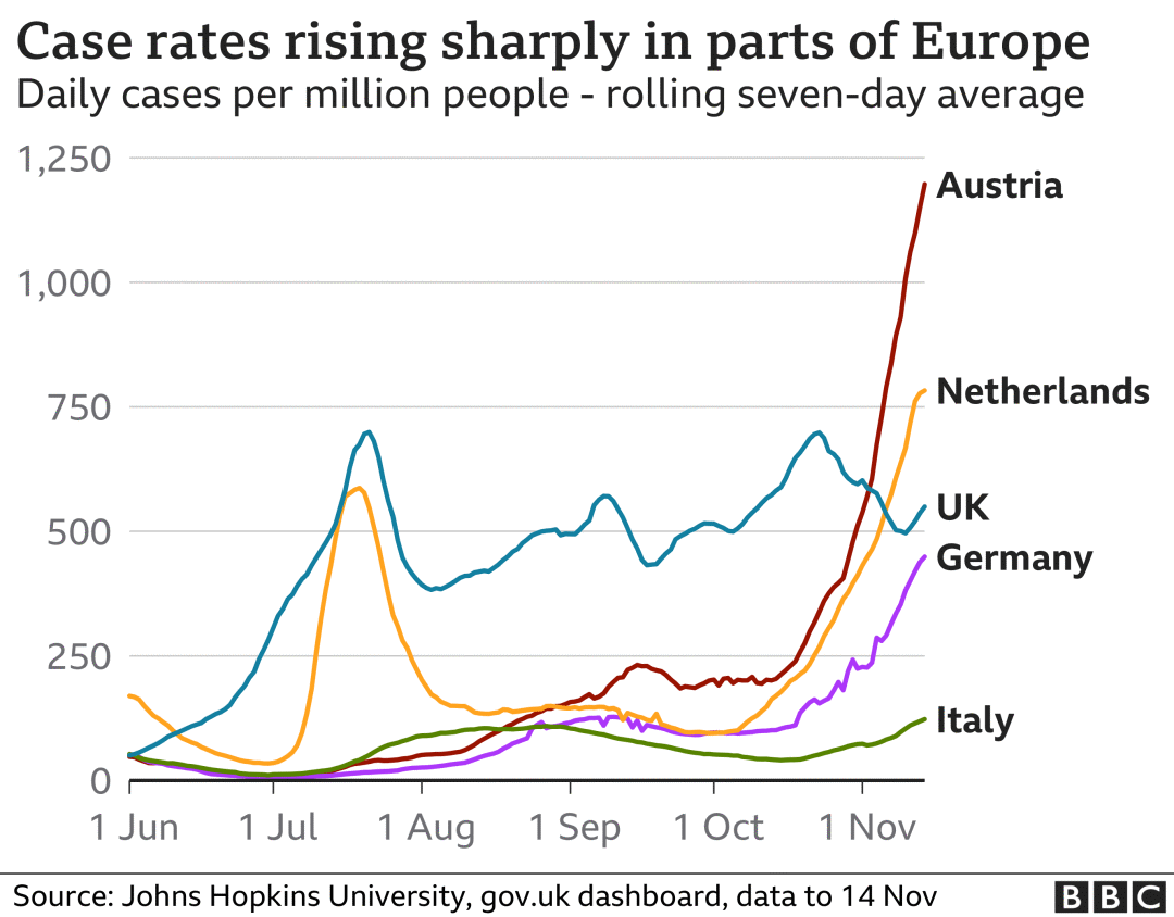 总的来说,欧洲再次成为受全球疫情影响最严重的地区,一些国家,包括德国、荷兰、北欧多国正在出台限制措施,并警告当地群众病例正在激增。