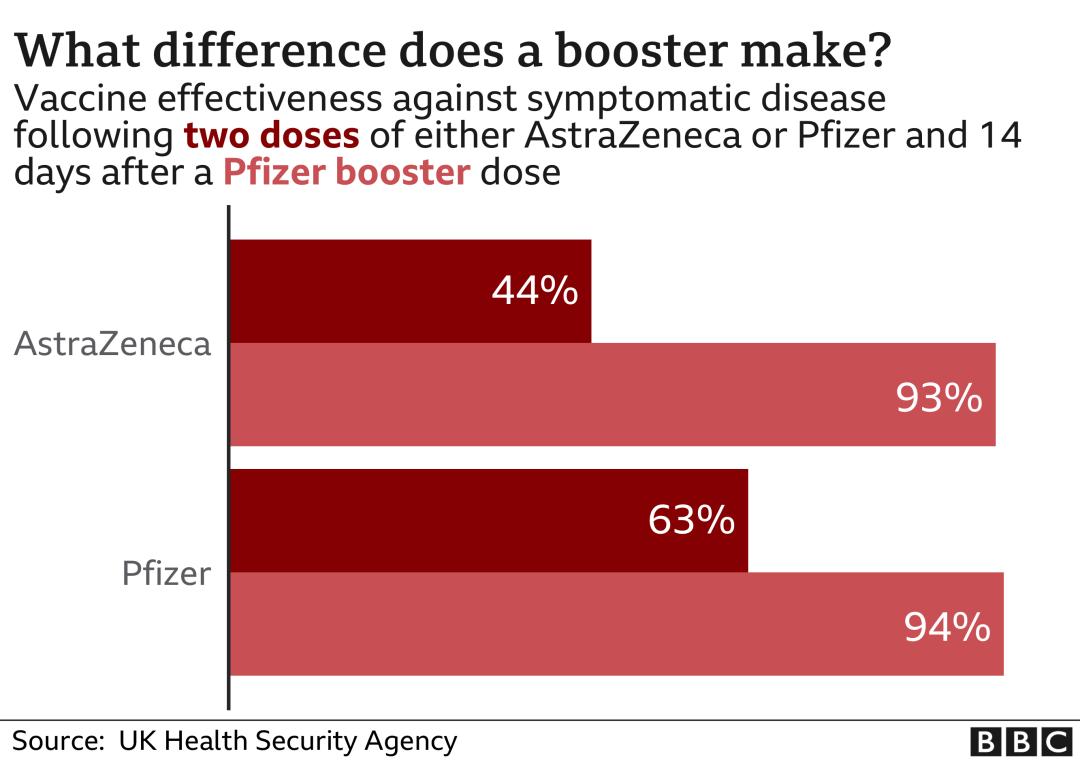 英国健康安全局UKHSA的首次研究结果显示,在接受强化剂两周后,50岁及以上的群体在接种牛津/阿斯利康疫苗的情况下对新冠的有症保护率为93.1%,辉瑞更是高达94%。