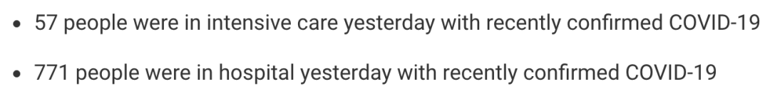 从2020年3月5日以来,苏格兰地区共有24,361名(+174)确诊患者出院。截至11月15日午夜,近期住院的疑似/确诊新冠患者771名(+12),其中57名(+2)确诊新冠在重症监护室ICU。