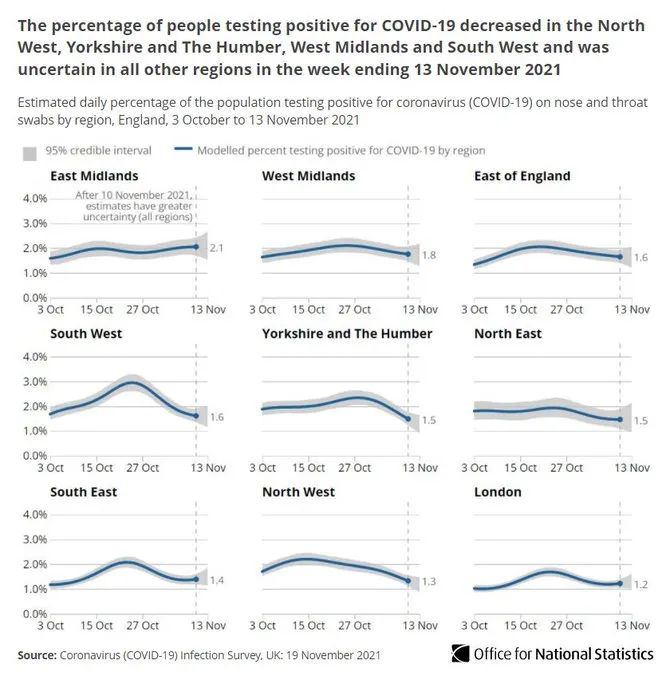 另外,在截至11月13日的一周内,英国总共记录了96.5万例新冠病毒感染病例,是自10月以来该数字首次降至100万以下。