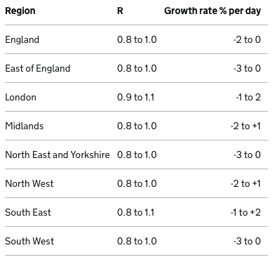数据显示,英格兰最新感染率R值为0.8-1.0。最新增长率范围保持在-2%至0%。这意味着每10个被感染的人将会继续感染8到10个人。新增感染数量可能大致持平或每天缩减最多2%。