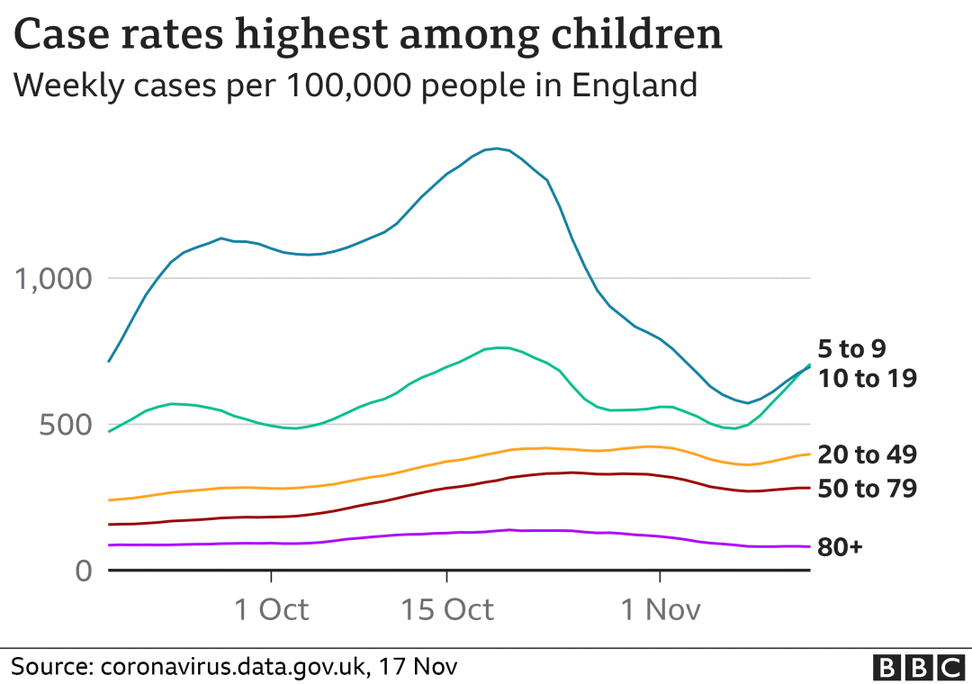 从年龄来看,英格兰5至9岁儿童的感染病例率最高,每10万人中有723例感染病例。而之前的“高风险的群体”,10至19岁的人的感染比率为每10万人中有694.2例感染。