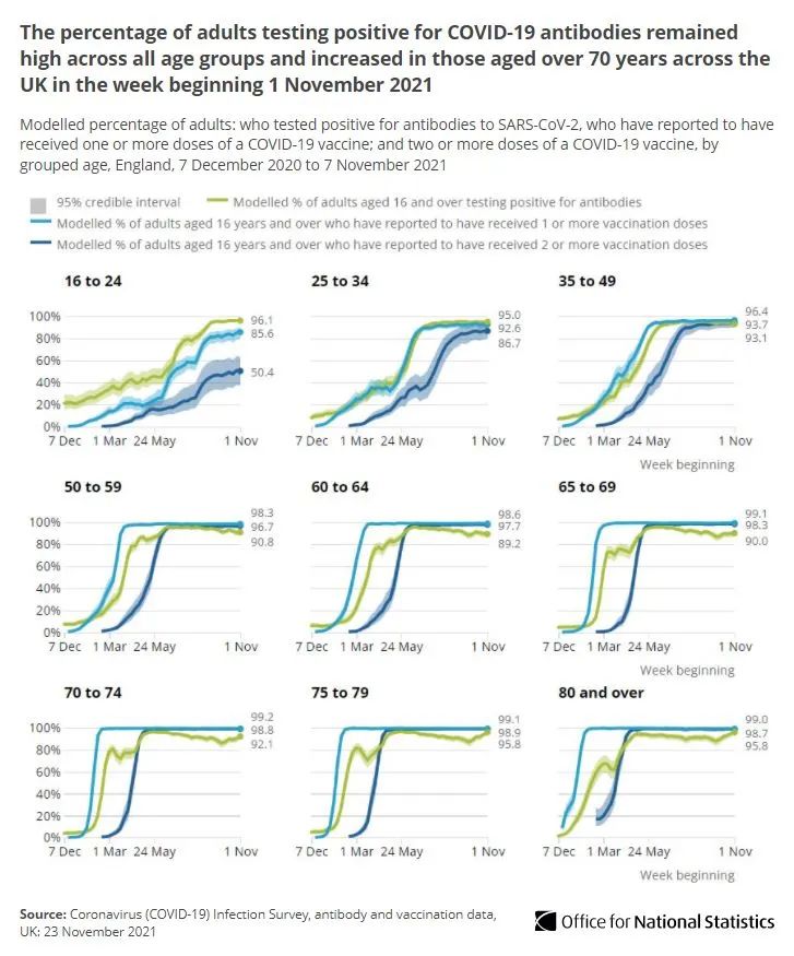 国家统计局ONS还透露:所有年龄段的抗体阳性率都保持在高水平,值得一提的是在70岁及以上的人中抗体阳性率还在增长,因为该群体进行了较早的第3剂加强疫苗接种。