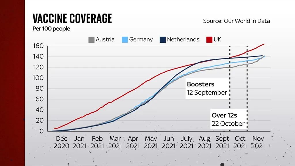 相对于英国疫苗推广计划而言,德国、奥地利和荷兰在最近几周才刚刚勉强达到英国的疫苗水平。与相比,这三个国家的剂量接种间隔也较短。