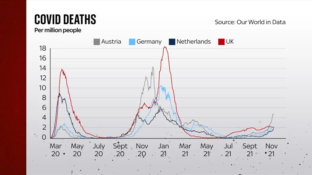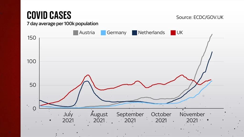 具体来看,奥地利和荷兰的7日平均每10万人的新冠确诊率增长尤为迅速。同时,德国的水平现在大约与英国持平,但病例正在迅速上升。