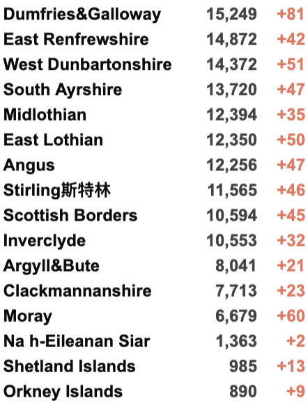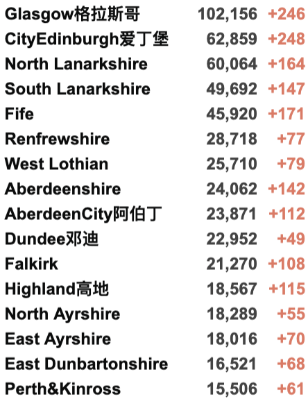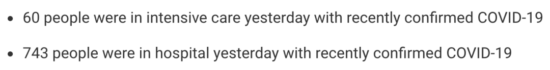 从2020年3月5日以来,苏格兰地区共有24,822名(*)确诊患者出院。截至11月23日午夜,近期住院的疑似/确诊新冠患者743名(-7),其中60名(+1)确诊新冠在重症监护室ICU。