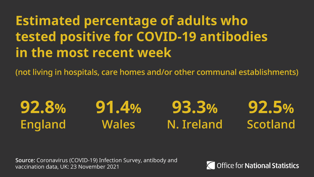 根据今日国家统计局ONS刚刚公布的数据,在英国,新冠抗体检测呈阳性的成年人比例仍然非常高——在英格兰,抗体阳性率达到92.8%,威尔士为91.4%,北爱尔兰为93.3%,苏格兰为92.5%。