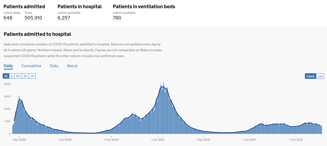 11月23日数据:目前住院的确诊新冠患者6,257人,累计住院新冠患者总数为505,910(+648)。