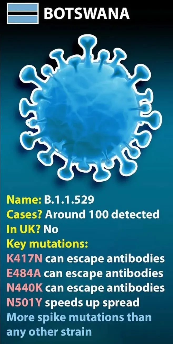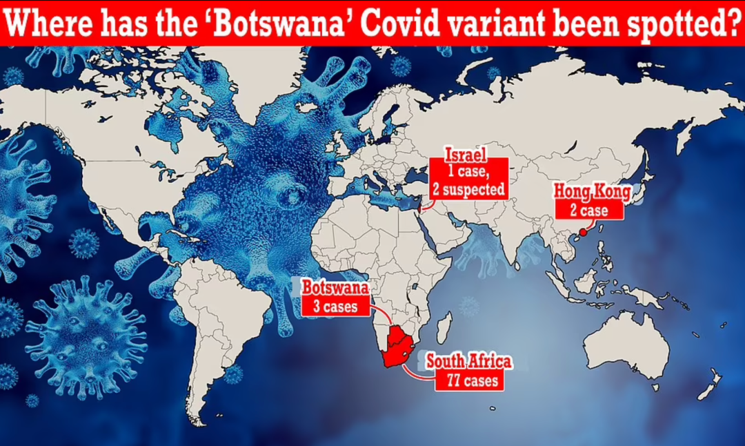 据报道,该新变种于11月11日在博茨瓦纳被首次发现,南非于11月14日发现了第1例病例,中国香港2名有南非旅行史的回国旅客也确诊感染该新变种,截止目前全世界累计记录病例约100例。英国截至目前还没有记录到该变种的病例。