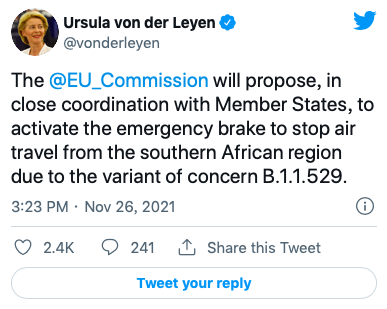 她在社交媒体上说:“委员会将与各成员国密切协调,基于对变体B.1.1.529的关注,决定提议启动紧急制动,停止来自南非地区的航空旅行。”