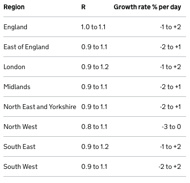 英格兰的最新感染率R值已经上升到1以上,最新估计显示在1.0-1.1之间。这意味着每10个被感染的人,平均会感染10到11个其他人。而感染的每日增长估计在-1%和+2%之间。