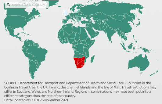 英国卫生部长Sajid Javid发表紧急声明称,从英国当地时间周五(11月26日)12:00开始,博茨瓦纳Botswana、埃斯瓦蒂尼Eswatini、莱索托Lesotho、纳米比亚Namibia、南非South Africa、津巴布韦Zimbabwe,6个国家将被列入红色名单。