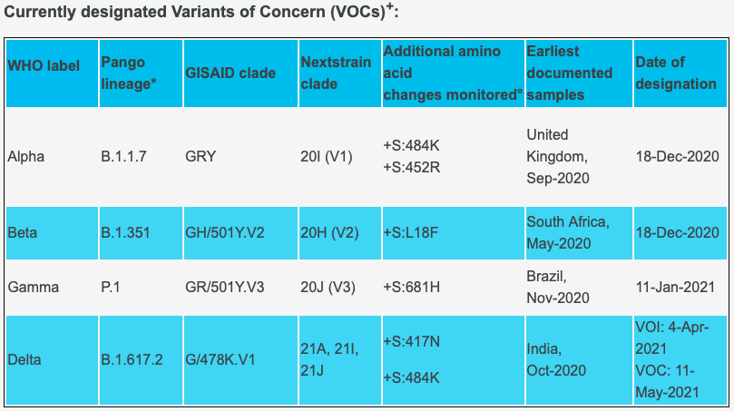 世卫组织官网显示,目前已将4种新冠病毒变种列为“需要关注”(Variants of Concern, VOC)的变种,分别是:最早在英国发现的Alpha、南非发现的Beta、巴西发现的Gamma以及印度发现的Delta。